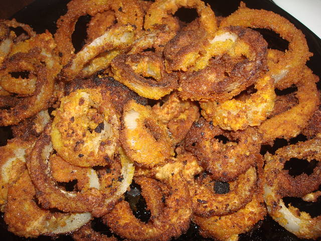 Для приготовления кляра нам надо смешать яйцо, муку, специи и холодную воду (чтобы кляр получился воздушным) до консистенции сметаны. Кольца лука обмакиваем в кляр и жарим их в раскаленном растительном масле до золотого цвета.